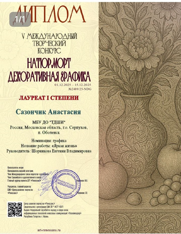 Поздравляем с Лауреатом I степени нашу ученицу Сазончик Анастасию и преподавателя Евгению Владимировну Шорникову в V Международном творческом конкурсе «Натюрморт. Декоративная графика!»